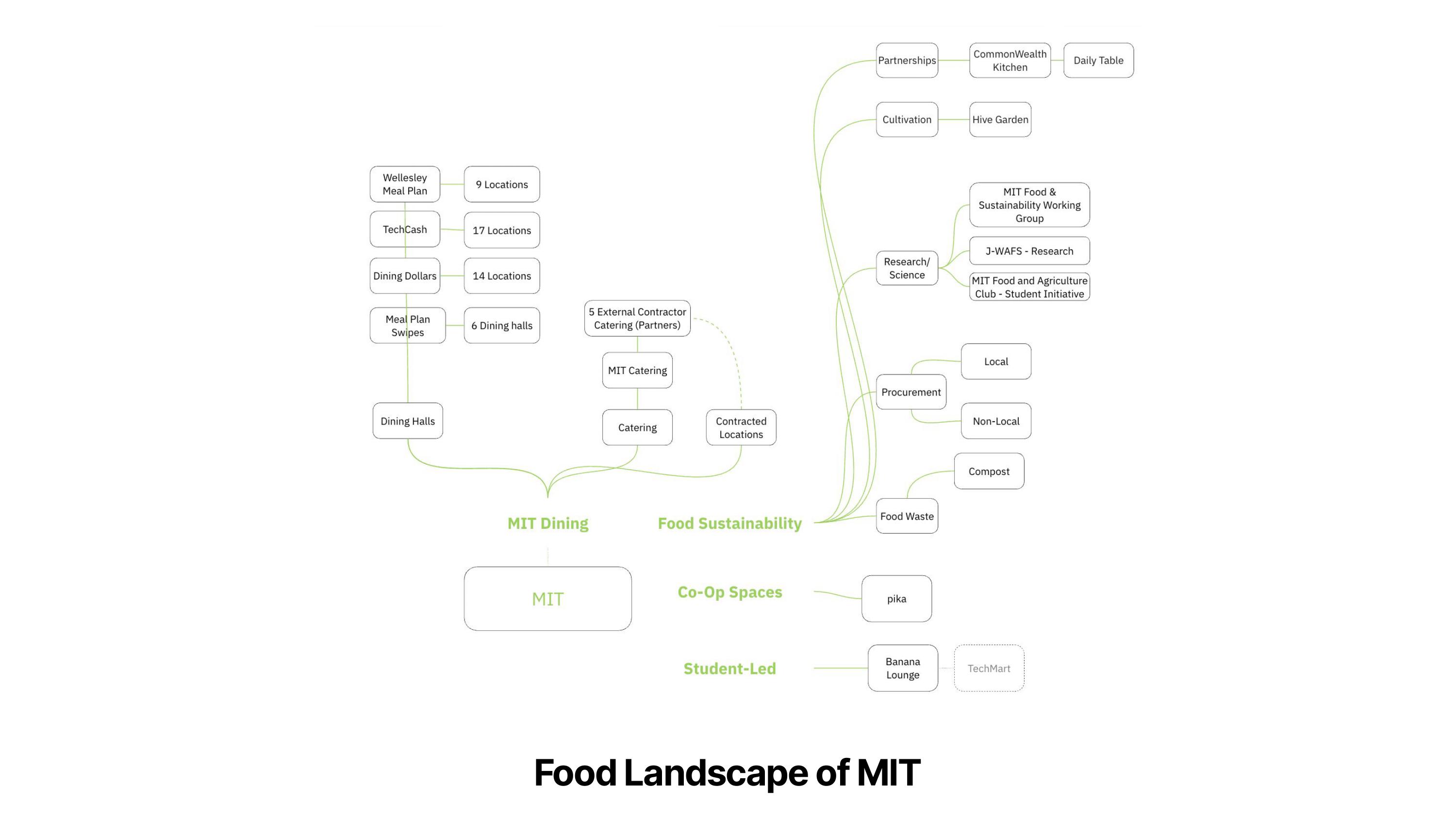 The research centers on anchor institutions because they are long-term fixtures in the community, wielding substantial power through capital investments, dining service, procurement, employment, and engagement with students. Research suggests that 30 percent of all college students experienced food insecurity at some point in their college careers, and that students who identify as “Hispanic or Latino” or “Black or African American” or the first-generation to attend college are more likely to be food insecure. This underscores the significance of university-level policies, which can either exacerbate or narrow disparities in food and nutrition security (defined as food affordability, access, utilization, and stability). These university-level decisions made by MIT and Harvard collectively shape the local food landscape while simultaneously influencing the food supply chain.